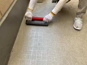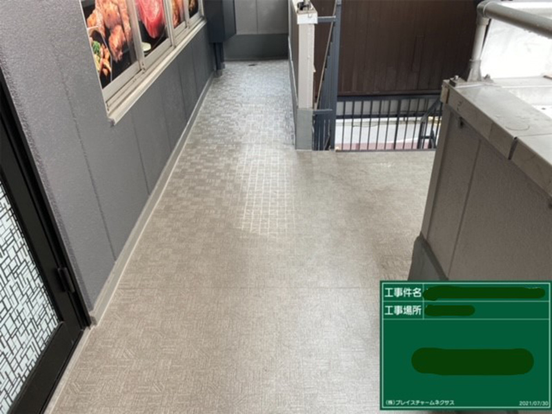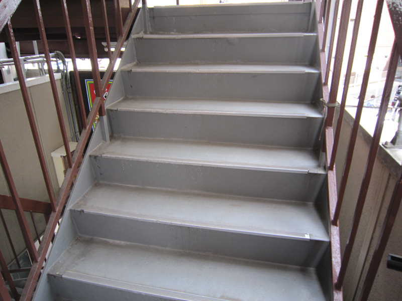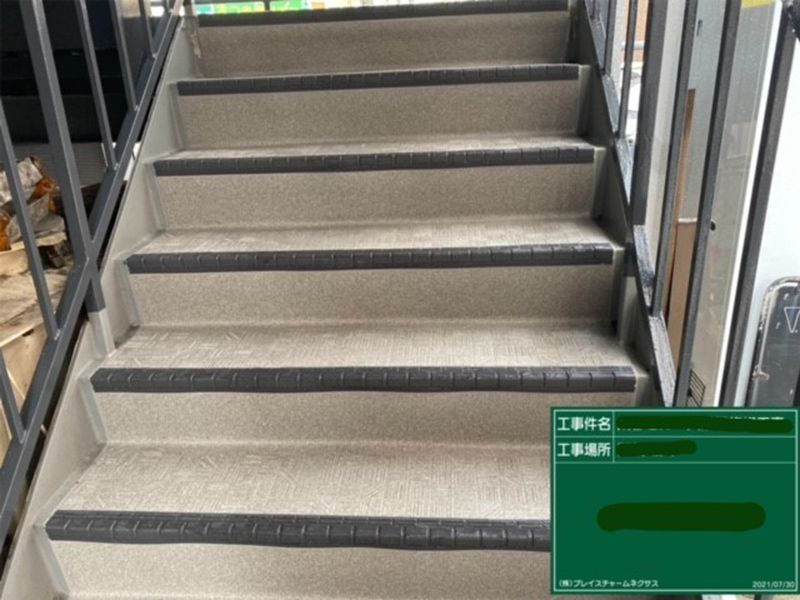 共用廊下・階段は長尺シートを敷き込み、鉄骨階段特有の“コツンコツン”という足音が軽減するように遮音・防滑効果のあるシートで施工。
