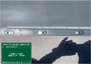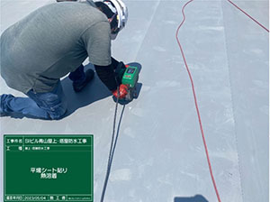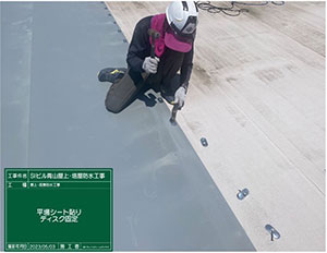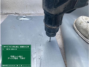 塗る防水、塩ビシートを張る防水、高耐候の防水工法の3パターンで、工事の際の諸問題、工期、金額、ランニングコストと比較し提案させていただきました。結果、25年の長期保証が可能なポリフィンシート防水をご選択いただきました。この工法の最大のメリットは25年という長期保証があること。逆に難点は、ディスクを打ち込む際に、ドリルで床に穿孔して、ディスクを打ち込むのに断続的に騒音が出るという点です。騒音のためにテナントさんから騒音で仕事にならない、うるさいから工事をストップしろ!といわれるのが最悪のパターンです。工事の時期に関してもテナントさんにご迷惑をかけないで、施工する時期をいつにするのか、職人さんと打合せをしました。