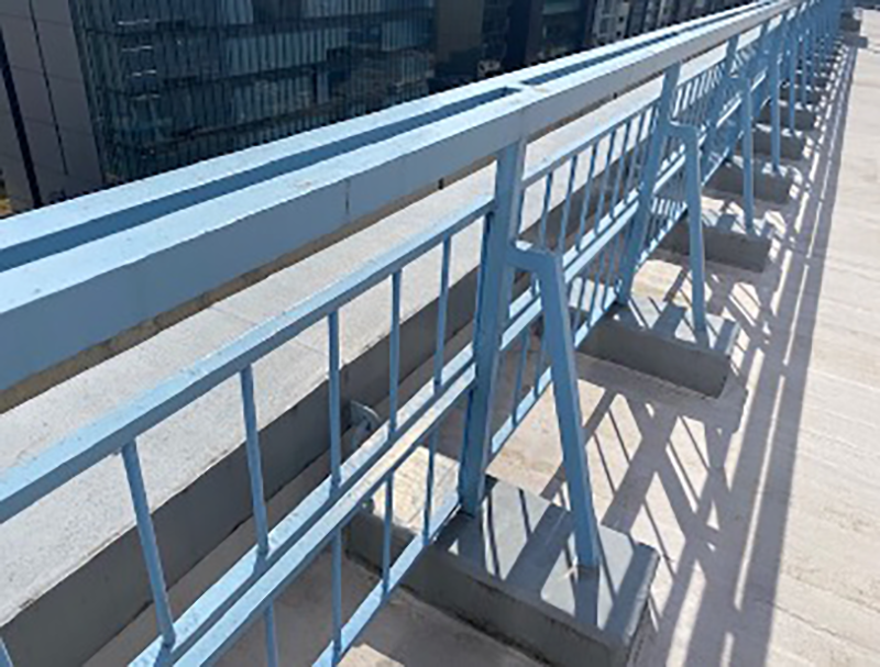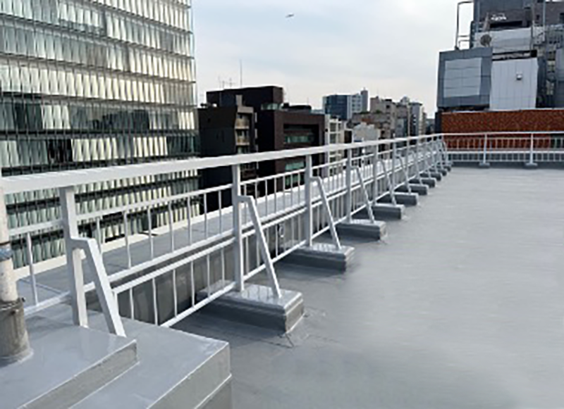 ポリフィンシート防水は、シートとシートを熱で溶着します。この技術も認定の技術資格が必要となり、研修を受けた職人さんでないと容易にできない工法となります。また、手摺の架台のところは塗るウレタン防水との複合防水工法にて施工。